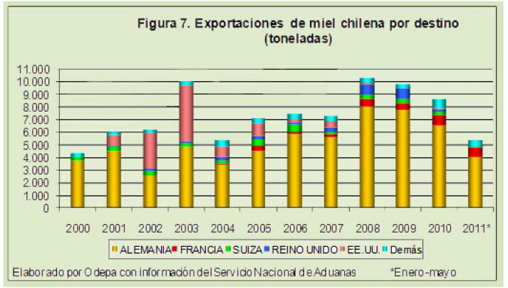 Con fecha del 6 de septiembre de 2011 la Corte Europea dictaminó una sentencia que tendrá graves impactos en las exportaciones de miel chilena a Europa. En el gráfico se puede observar que Alemania es el principal mercado para las exportaciones chilenas, y en adelante allí no se aceptará miel contaminada con transgénicos.