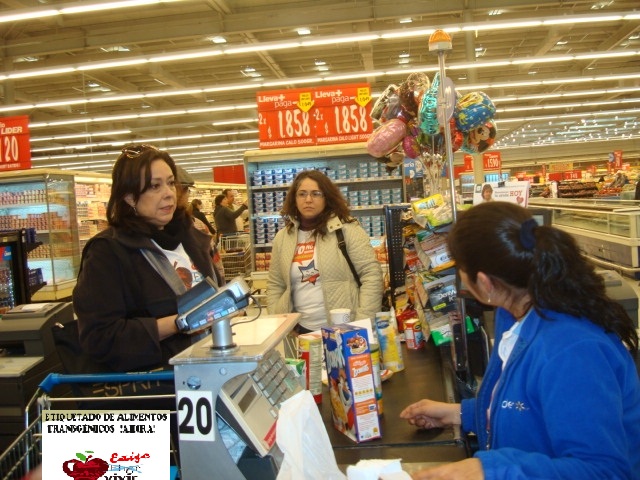 Como el gobierno chileno y los parlamentarios siguen negándonos nuestro derecho a saber y a elegir qué comemos, decidimos etiquetar los alimentos transgénicos del supermercado Híper Líder (Walmart) de Santiago, ubicado en Avenida Libertador Bernardo O´Higgins 5199, Estación Central.